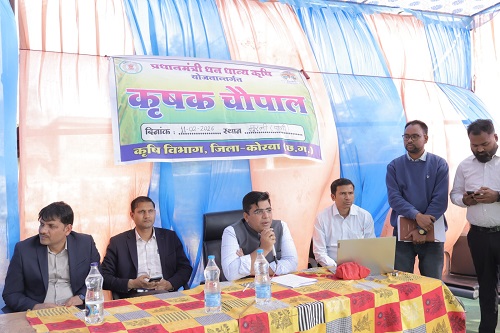 कोरबा। कलेक्टर  कुणाल दुदावत ने आज विकासखंड पाली के ग्राम मुरली में आयोजित कृषि चौपाल का आकस्मिक निरीक्षण कर व्यवस्थाओं एवं योजनाओं की जानकारी ली। इस अवसर पर उपस्थित किसानों को प्रधानमंत्री किसान सम्मान निधि योजना, फार्मर रजिस्ट्री, किसान क्रेडिट कार्ड, मृदा स्वास्थ्य कार्ड योजना, एफपीओ के अंतर्गत नए किसानों को जोड़ने, ग्रीष्मकालीन धान के स्थान पर दलहन, तिलहन एवं मक्का फसलों को प्रोत्साहित करने, प्रधानमंत्री किसान मानधन योजना, प्रधानमंत्री कृषि सिंचाई योजना अंतर्गत सूक्ष्म सिंचाई (ड्रिप एवं स्प्रिंकलर) के विस्तार, किसान समृद्धि योजना अंतर्गत नलकूप स्थापना, शाकम्भरी योजना के तहत पंप वितरण, कृषि यांत्रिकीकरण योजना, आगामी खरीफ मौसम हेतु दलहन, तिलहन एवं लघुधान्य फसलों के लिए क्लस्टर ग्राम चयन तथा अग्रिम खाद उठाव सहित विभिन्न योजनाओं की जानकारी देते हुए लाभ उठाने की अपील की।