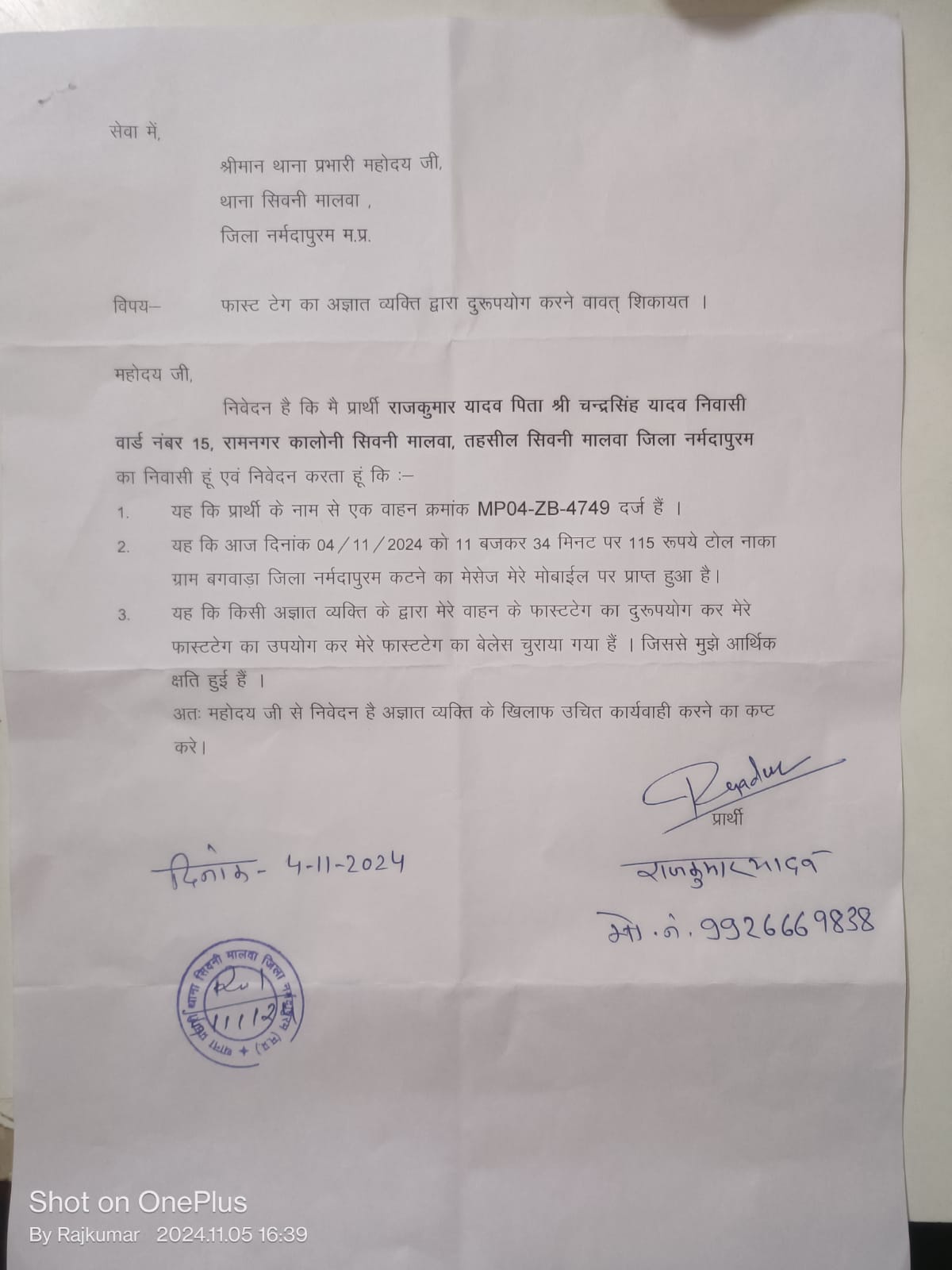 सिवनी मालवा निवासी राजकुमार यादव के मुताबिक 04 नवंबर 2024 को गाड़ी घर पर खड़ी थी। करीब 11.33 बजे पेटीएम वॉलेट फास्टैग से बगवाड़ा टोल प्लाजा पर 115 रुपये कटने का मैसेज आया। इसमें कार नंबर MP04ZB4749 लिखा था। उन्होंने तुरंत मामले की गंभीरता को देखते हुए अपने साथी मनीष महेंद्र के साथ सिवनी मालवा थाने जाकर आवेदन दिया। राजकुमार यादव का कहना है। की अगर आपके साथ ऐसा हो तो सबसे पहले आपको नजदीकी पुलिस थाने में आवेदन देने के पश्चात एनएचएआई की टोल फ्री हेल्पलाइन नंबर 1033 पर कंप्लेन दर्ज करा सकता है। आप फास्टैग इश्यू करने वाले बैंक की हेल्पलाइन नंबर पर भी शिकायत कर सकते हैं। शिकायत सही होती है तो तो एक महीने में गलत काटी गई रकम लौटा दी जाती है।