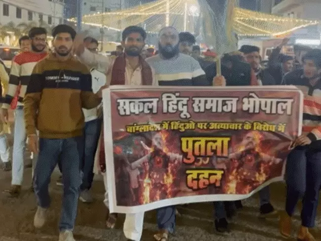 पड़ोसी देश बांग्लादेश में अल्पसंख्यक हिंदू समाज पर हो रहे कथित अत्याचारों के विरोध में भोपाल में शनिवार को आक्रोश देखने को मिला। सकल हिन्दू समाज के आह्वान पर मिनाल शॉपिंग स्ट्रीट पर पुतला दहन किया गया। जिसमें बड़ी संख्या में लोग शामिल हुए। प्रदर्शनकारियों ने बांग्लादेश में हिंदू समुदाय पर हो रही हत्याओं, धार्मिक उत्पीड़न और मानवाधिकार उल्लंघनों को गंभीर चिंता का विषय बताते हुए इसे मानवता के खिलाफ अपराध करार दिया।