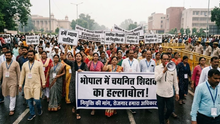भोपाल। माध्यमिक और प्राथमिक शिक्षक (खेल, गायन, वादन, नृत्य) 2022 भर्ती के चयनित अभ्यर्थियों ने बुधवार को राजधानी में धरना देकर अपना विरोध दर्ज कराया। नियुक्ति में लगातार हो रही देरी से नाराज अभ्यर्थी पांचवीं बार प्रदर्शन करने को मजबूर हुए हैं। अभ्यर्थियों का कहना है कि 25 सितंबर को रिजल्ट जारी होने और दस्तावेज सत्यापन पूरा होने के बावजूद उन्हें अब तक जॉइनिंग नहीं दी गई है। करीब आठ महीने बीत जाने के बाद भी न तो कोई स्पष्ट शेड्यूल जारी हुआ है और न ही नियुक्ति की तारीख बताई गई है।