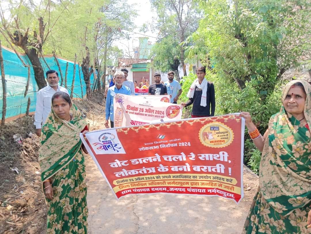 # के अंतर्गत मतदाता जागरूकता अभियान के तहत मतदान हेतु 05 दिन शेष बचे हैं। मतदाताओं को जागरूक कर वोट का प्रतिशत बढ़ाने का काम भी प्रशासनिक अमले के द्वारा निरंतर किया जा रहा है। जागरूकता अभियान के इसी क्रम में जनपद पंचायत नर्मदापुरम की दमदम पंचायत में मतदाता जागरूकता अभियान चलाया गया। अभियान के दौरान पूरे ग्राम में रैली निकालकर मतदाताओं को जागरूक किया। दमदम सोहागपुर 138 विधानसभा का ग्राम है जिसके अंतर्गत आने वाले मतदान केन्द्रद क्रमांक 158 में 1045 मतदाता हैं। बीएलओ रोहित चौरे बताया कि विगत विधानसभा 2023 में पोलिंग बूथ पर 88.75 प्रतिशत मतदान हुआ था इस बार भी हमारी कोशिश है कि मतदान का प्रतिशत अच्‍छा रहे। ग्राम सचिव तुकाराम चौरे ने बताया कि दमदम पंचायत में 3 ग्राम आते हैं जिसमें इस मतदान केन्द्र पर दमदम एवं पिपरियाखुर्द 02 ग्राम समिल्लित हैं दोनों ग्रामों जागरूकता अभियान चला जा रहा हैं एवं पूरा प्रयास किया जा रहा है कि दोनों ग्राम के मतदाता आकर शत प्रतिशत मतदान करें। जागरूकता अभियान की रैली में ग्राम पंचायत सचिव तुकाराम चौरे, सहायक सचिव रोहित चौरे, आंगनवाड़ी कार्यकर्ता प्रेमलता चौरे, मुन्नीय मेहरा आंगनवाड़ी सहायिका, इमरती बाई केवट, संगीता अहिरवार, आशा कार्यकर्ता राजश्री पटैल, प्रधान पाठक राजीव चौहान, शिक्षक पूनम तिवारी, प्रीति यदुवंशी, वंदना ठाकुर, ज्योति यादव एवं ग्राम के युवा सम्मिलित रहे।